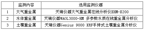 綜上所述,有色金屬礦業(yè)對(duì)環(huán)境的重金屬污染包括了大氣、水體和土壤三個(gè)方面。因此,為了全面監(jiān)測(cè)有色金屬礦業(yè)環(huán)境重金屬監(jiān)測(cè)系統(tǒng)包括:大氣、水體和土壤三個(gè)部分,選用監(jiān)測(cè)儀器如下表: